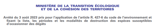 Arrêté Ministèriel de la Transition Ecologique et de la cohésion des Territoires du 3 août 2023 pris pour application de l'Art. R. 427-6 du Code de l'Environnement et fixant la liste, les périodes et les modalités de destruction des espèces susceptibles d'ocassionner des dégâts.