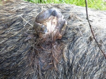 Sanglier retrouvé mort dans une retenue de barrage, présentant une balle de panse.